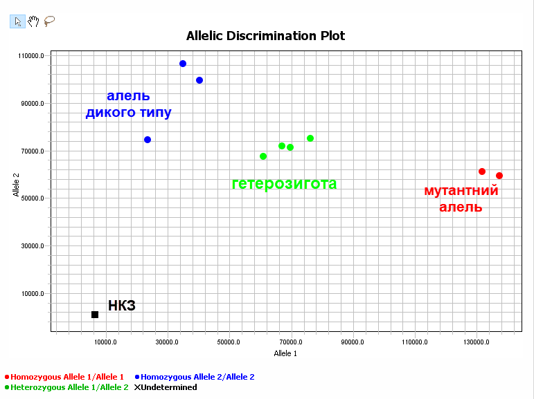 - контрольный образец Мутантный аллель соответствует точке на оси Allele 1 (красный цвет);