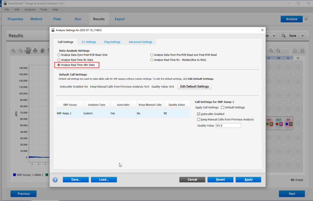 Если при автоматической обработке данных положительный или отрицательный контрольный образец оценен некорректно или образец отображается как «х» – результат неопределен*, то перейдите в окно настроек в разделе Call settings и выберите Analyze Real-Time dRn Data → Apply (Рис. 7)