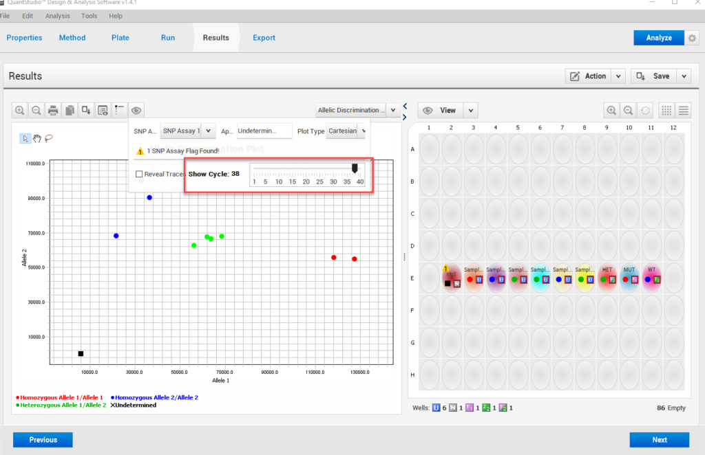 Для автоматического учета результатов программным обеспечением перейдите на вкладку дискриминации аллелей (Allelic Discrimination Plot).