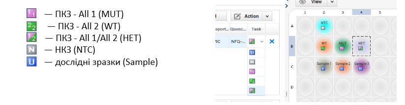 Необходимо выделить лунки с образцами и в окне Task выбрать соответствующий тип образца: