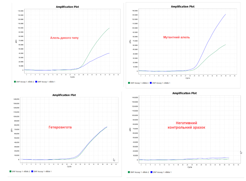 После запуска или открытия сохраненного эксперимента автоматически отображается вкладка с графиком амплификации (Amplification Plot). Проверьте контрольные образцы визуально. Для этого выберите линейный тип шкалы и оцените кривые амплификации, где в гомозиготных образцах высота флуоресценции одного из каналов выше другого, тогда как в гетерозиготных обе кривые проходят на одинаковом уровне. В отрицательных контрольных образцах – сигнал амплификации по каналам FAM и VIC отсутствует (Рис. 5).