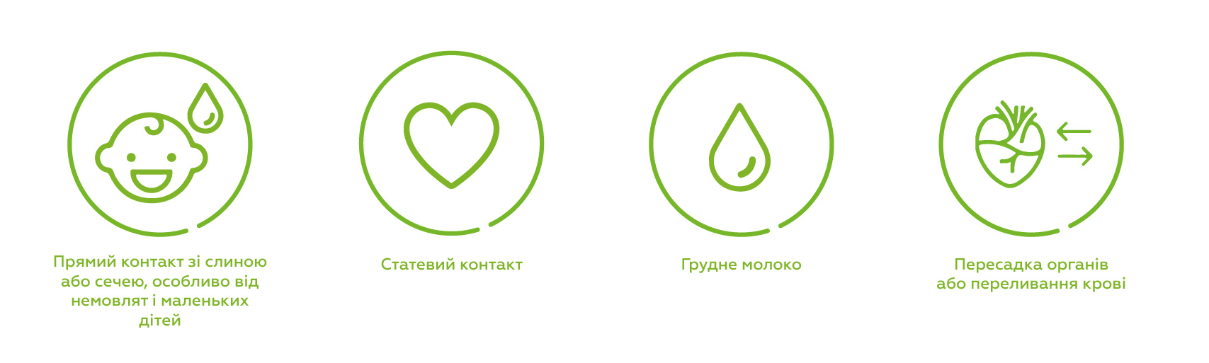 - Контактный путь — через слюну, кровь, грудное молоко.